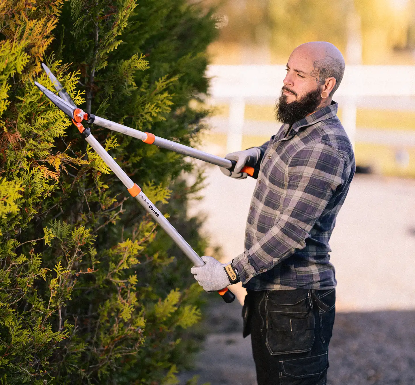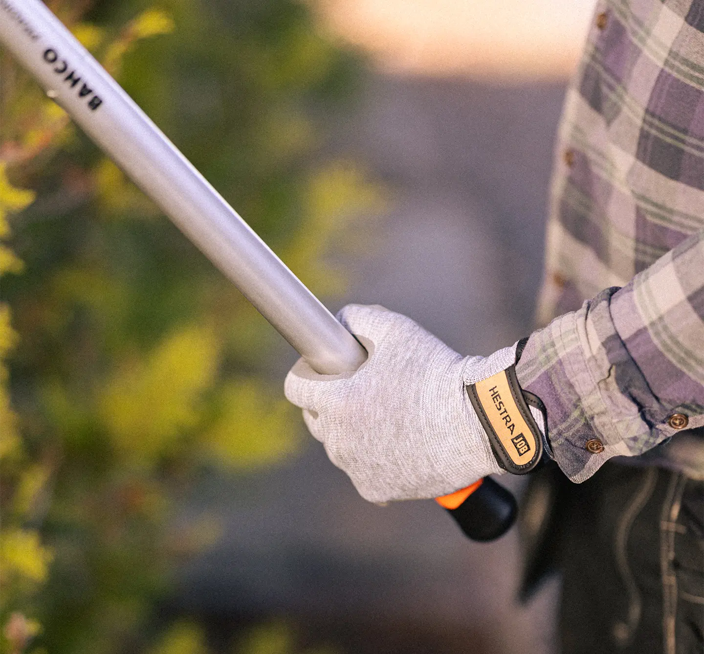 Hekkesaksen er utstyrt med ergonomiske håndtak som gir et komfortabelt og fast grep, selv ved lengre arbeidsøkter. Håndtakene er designet for å redusere tretthet i hånden og armen, noe som gjør det lettere å utføre krevende beskjæringsoppgaver uten ubehag.