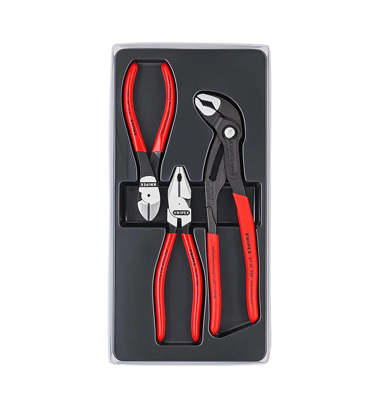 Knipex Power Set 00 20 10 er et omfattende tangsett som dekker de fleste behov for både profesjonelle håndverkere og dedikerte hjemmebrukere. Settet inneholder tre nøye utvalgte tenger, hver designet for spesifikke oppgaver, og leveres i en praktisk oppbevaringseske.