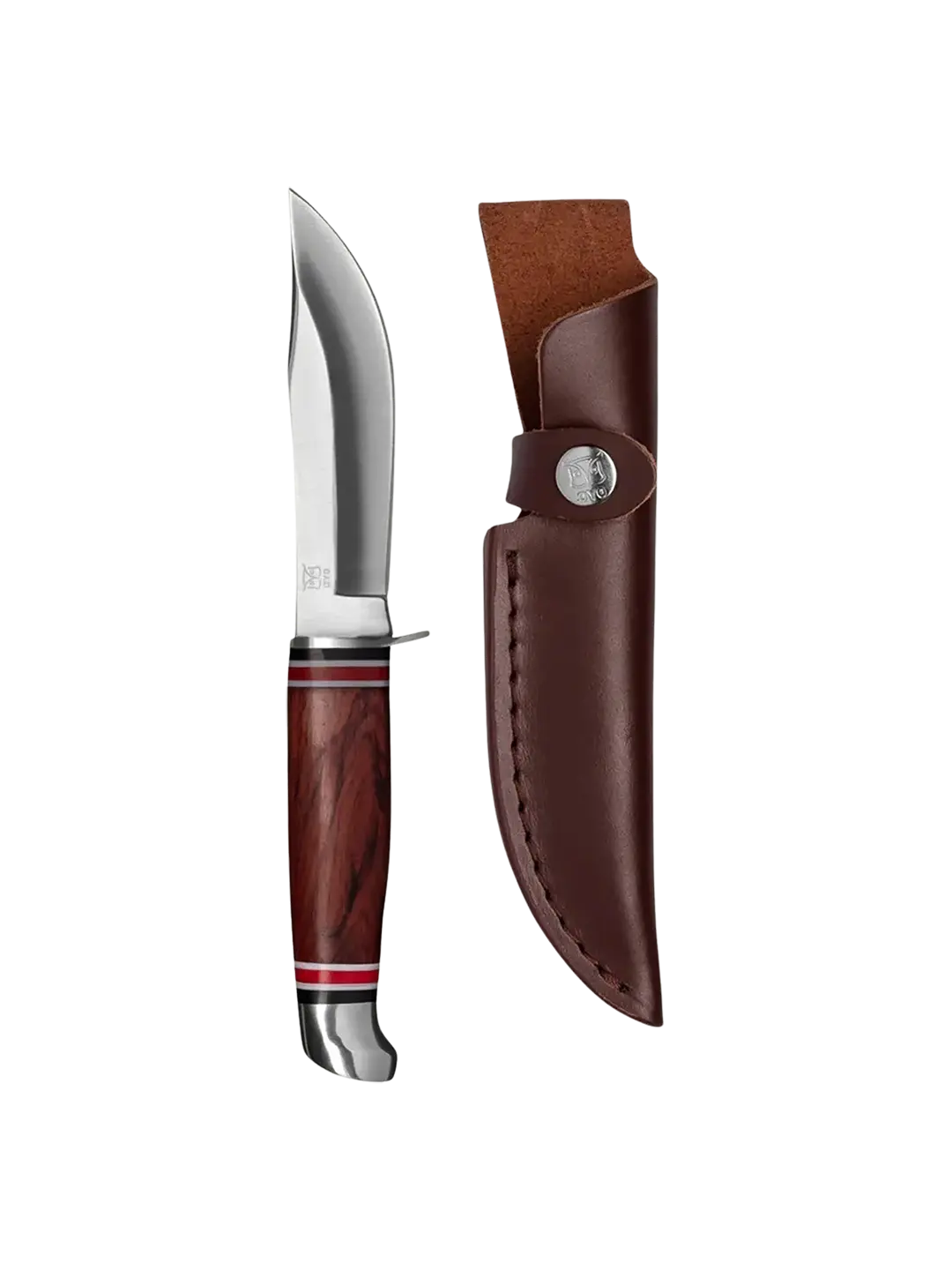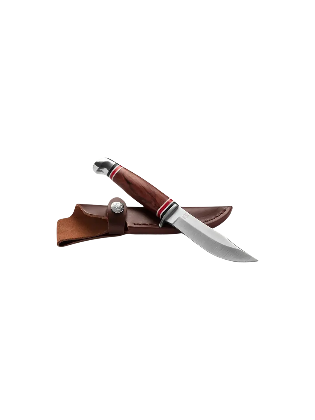 Robust slirekniv med 11 cm blad i høykvalitetsstål, ergonomisk rosentre-håndtak og solid lærslire.