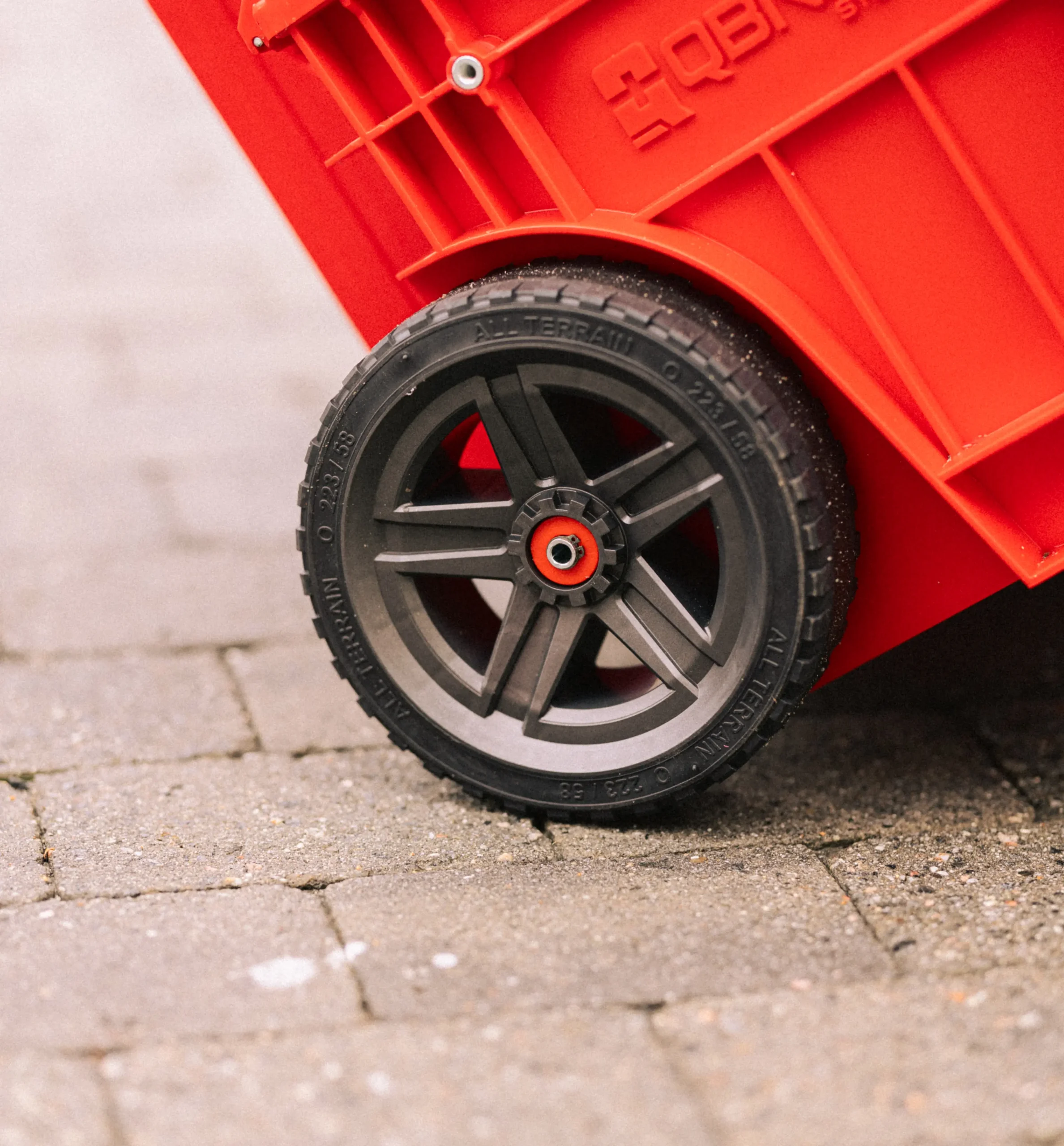De store hjulene er montert på en solid metallaksel, noe som gir stabilitet og god manøvrerbarhet. Uansett terreng, kan du stole på at trallekassen ruller jevnt og stødig.